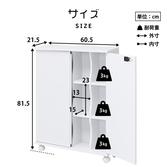 ・本体外寸:幅約60.5(取っ手込み63)×奥行約21.5×高さ約81.5(キャスター込み)cm |