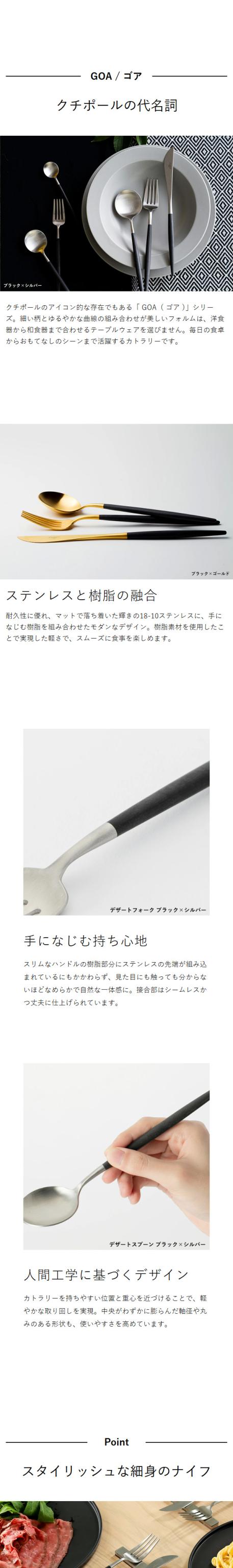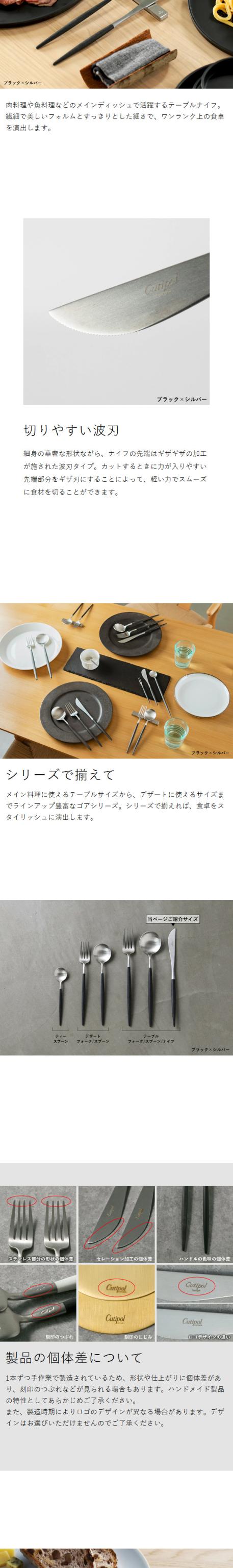 ポルトガルのカトラリーブランド「 Cutipol 」。マット仕上げのステンレスと樹脂を組み合わせた、GOAシリーズのテーブルナイフは、お肉なども切りやすいよう波刃加工が施されています。