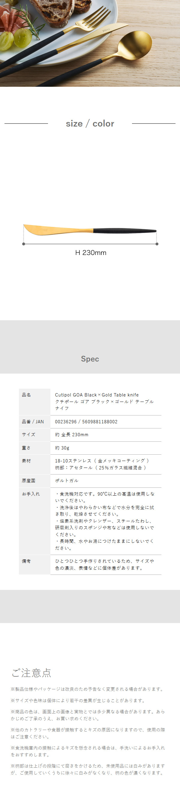 手になじんで使いやすい シンプルなディナーナイフ 世界中で愛されるポルトガルのカトラリーブランド「 Cutipol 」の『 GOA テーブルナイフ ブラック×ゴールド 』。マット仕上げのステンレスと手になじむ樹脂で構成されたシンプルなデザインは、テーブルウェアを選ばすどんなシーンにもなじみます。肉料理や魚料理などのメインディッシュにぴったりなサイズで、食卓をスタイリッシュに演出する細身のフォルムが魅力。波刃なのでローストビーフなどのカットもスムーズ。料理をより一層おいしく感じさせてくれる上質なカトラリーです。