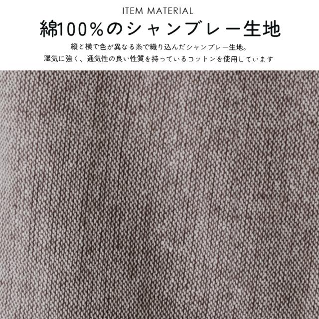 縦と横で色が異なる糸で織り込んだシャンブレー生地。 湿気に強く、通気性の良い性質を持っているコットンを使用しています