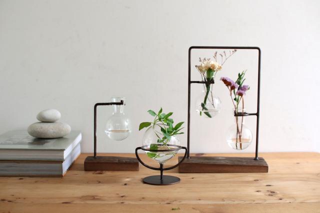 実験器具のようなユニークなデザインが特徴的な、アイアン&ガラスフラワーベースシリーズです。玄関やリビング、デスク周りに置くだけで、毎日の暮らしをちょっと特別に。シリーズで揃えると統一感のある空間になります。