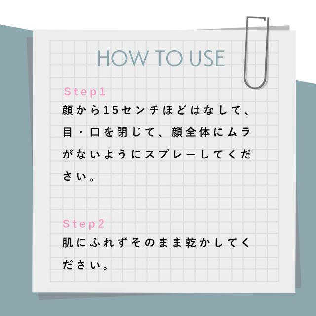 | ご使用方法 | 顔から15センチほどはなして、目・口を閉じて、顔全体にムラがないようにスプレーしてください。肌にふれずそのまま乾かしてください。 |