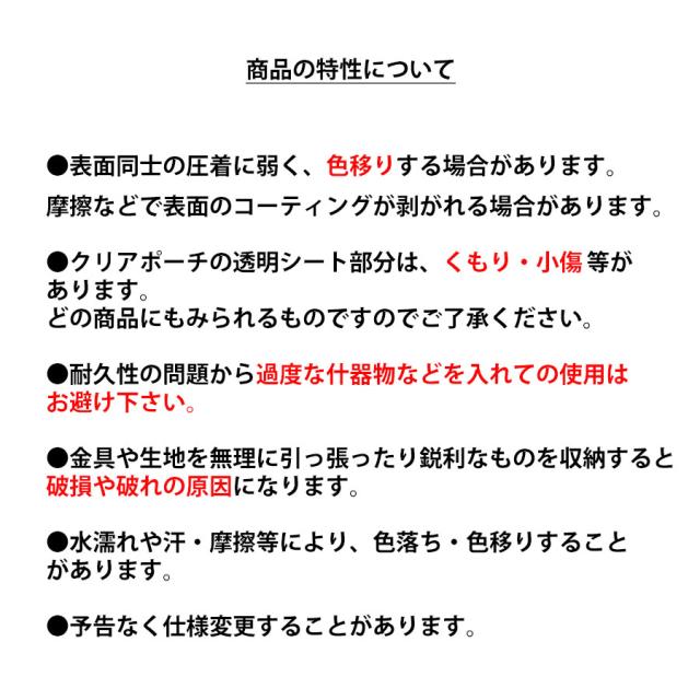 透明ポーチのシートは部分的にくもりがあったり小傷があったりしますが、素材の特性ですのでご理解の上お買い求めください。
