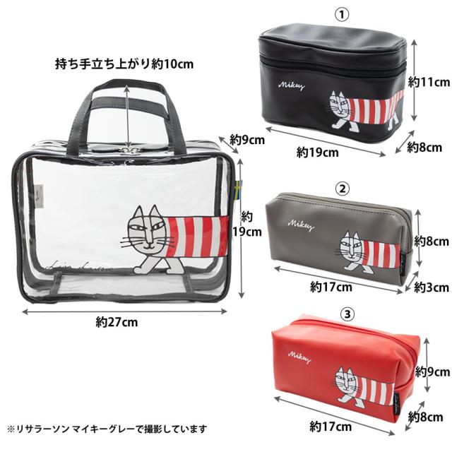 | サイズ | 【ハンドル付クリアポーチ】約W27×H19×D9cm 【(1)ポーチ】約W19×H11×D8cm 【(2)ポーチ】約W17×H8×D3cm 【(3)ポーチ】約W17×H9×D8cm |