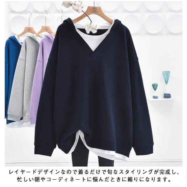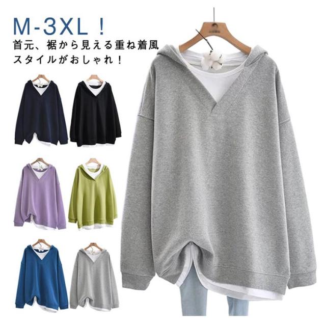 パーカー シンプル プルオーバー 秋 トレーナー レイヤード風 長袖 Vネック フード付き パーカー パーカー スウェット 無地 ゆったり 春 切り替えトップス カジュアル 大きいサイズ ビッグシルエット 幅広 着?せ お洒落 重ね着風 M-3XL
