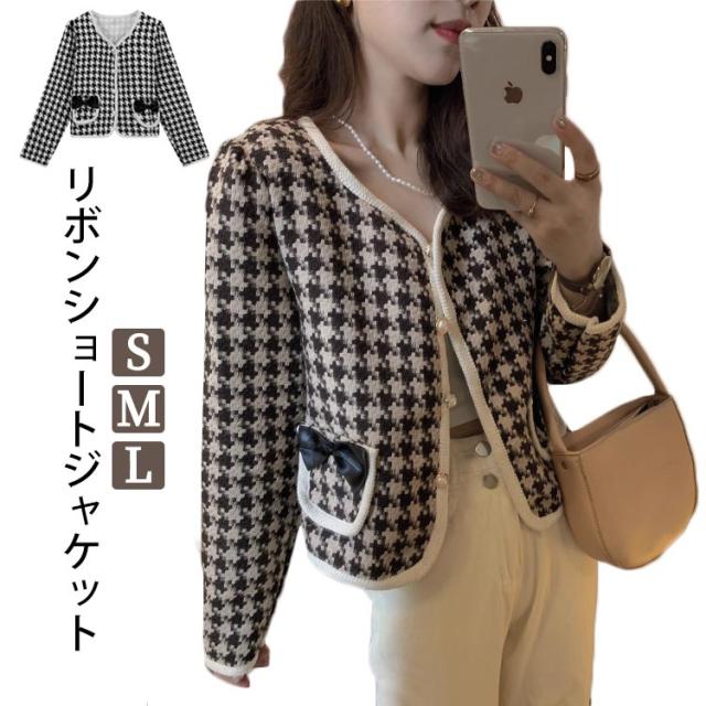 ツイードフリンジノーカラージャケット レディース 秋 冬 長袖 ライトアウター Vネック リボン ポケット付き ショート ジャケット 秋 冬 秋冬 ノーカラージャケット ツイードジャケット レディース ショート丈 セレモニー オケージョン