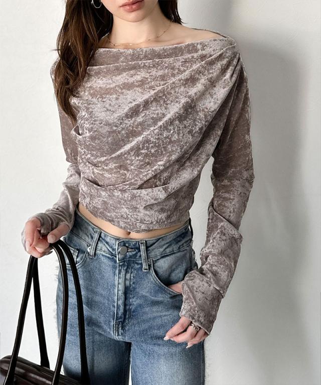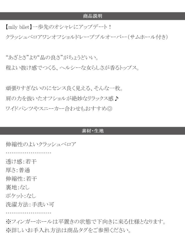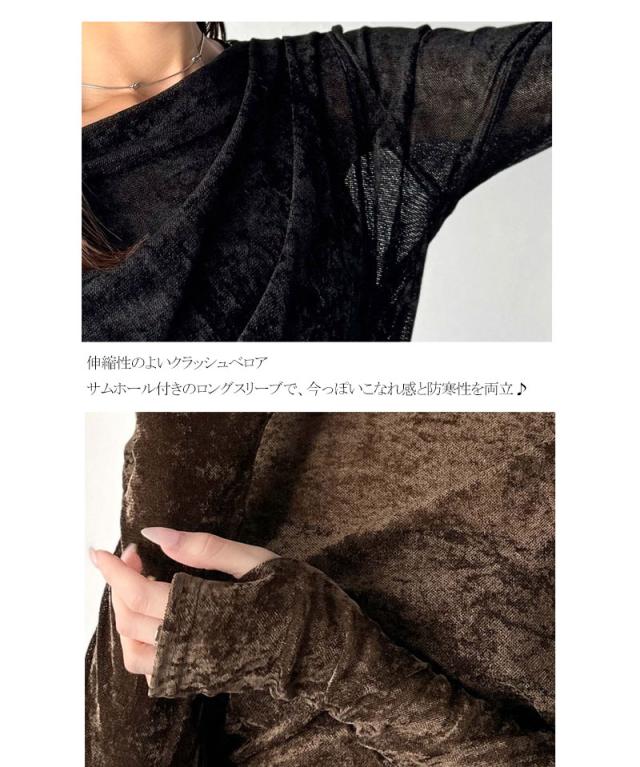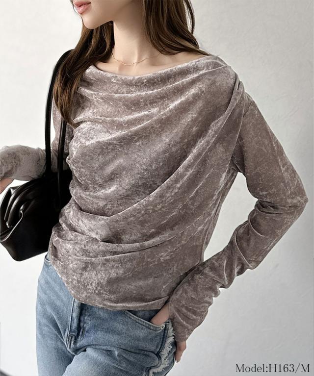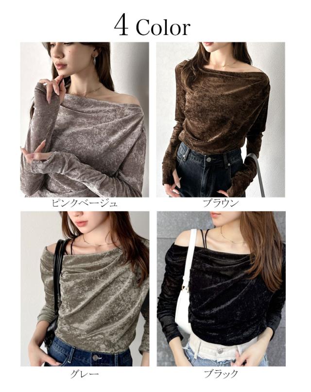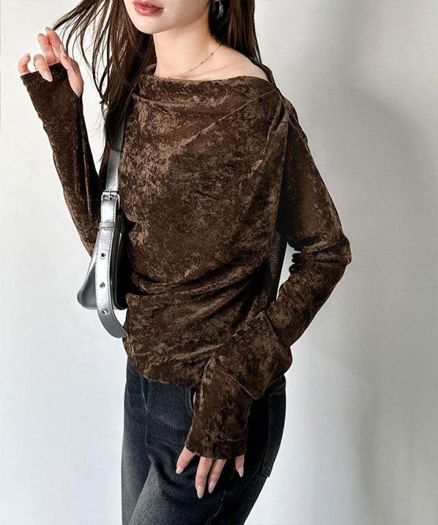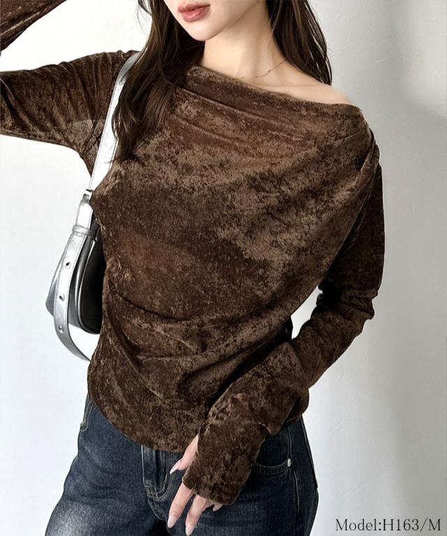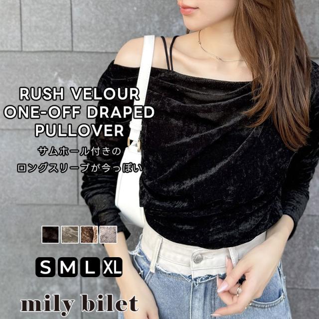 クラシカルエルフ秋新作 mily biletトップス Tシャツ レディース クラッシュ ベロア ワンオフショルダー ドレープ プルオーバー サムホール付き 大きいサイズ 2025aw mi1269007