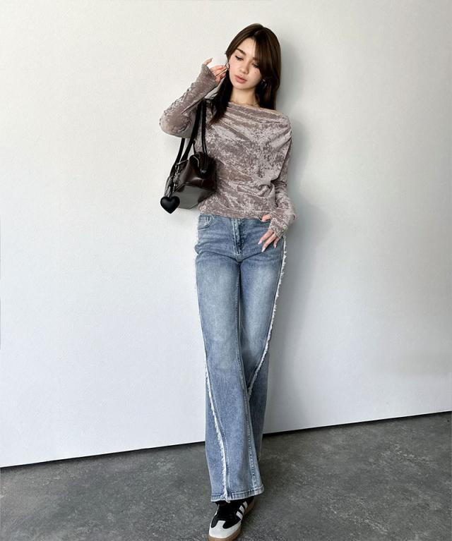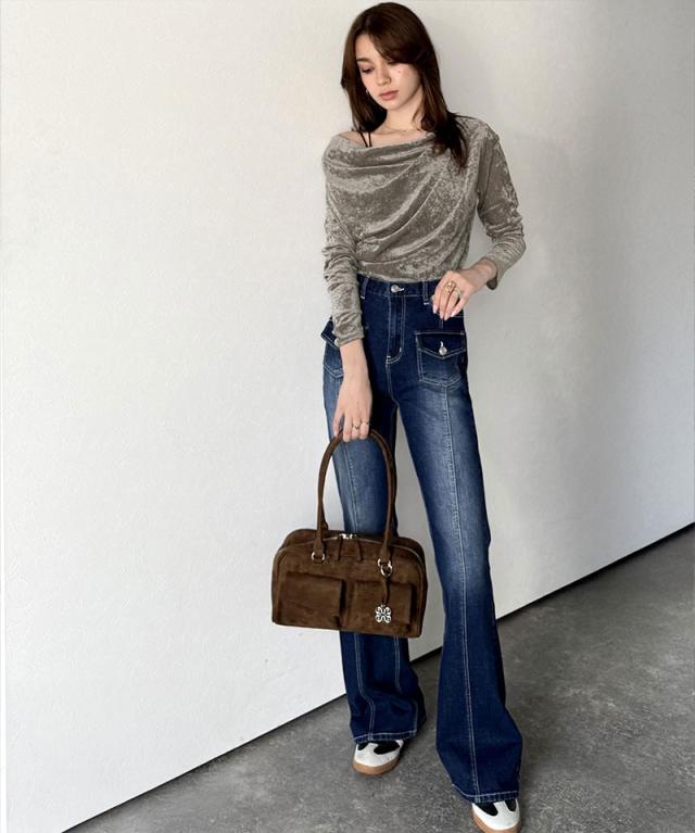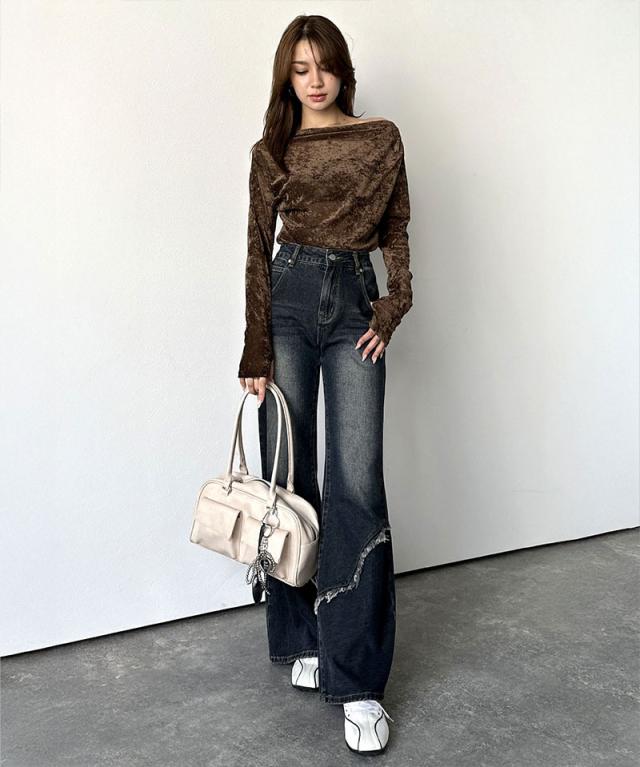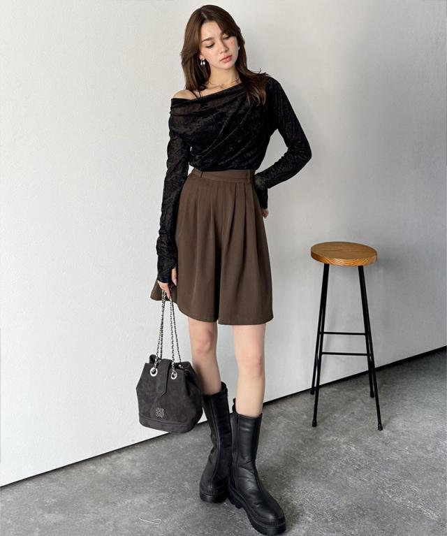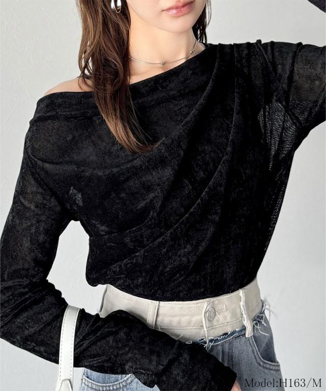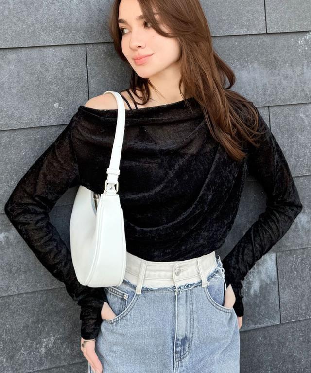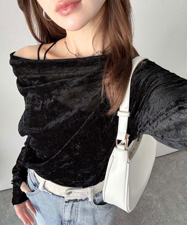 クラシカルエルフ秋新作 mily biletトップス Tシャツ レディース クラッシュ ベロア ワンオフショルダー ドレープ プルオーバー サムホール付き 大きいサイズ 2025aw mi1269007