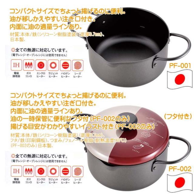 コンパクトサイズでちょっと揚げるのに便利。油が移しかえやすい注ぎ口付き。内面に油の適量ラインあり。油の一時保管に便利なフタ付(PF-002のみ)揚げる目安がわかりやすいイラスト付き(PF-002のみ)材質:本体/鉄(シリコーン樹脂塗装)(底厚0.7mm)、