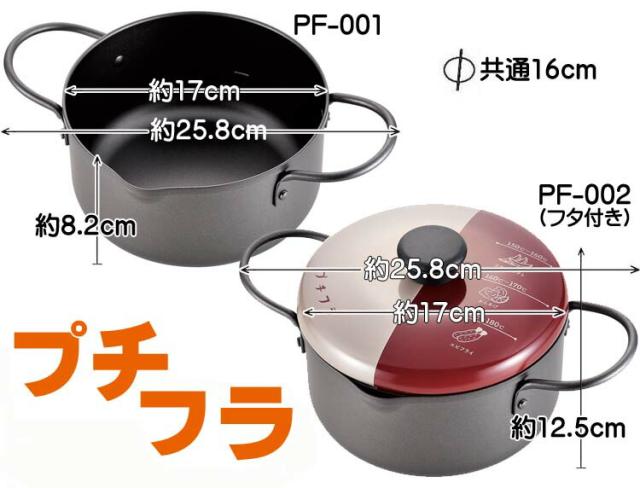 フタ/鉄(印刷鋼板)、つまみ/フェノール樹脂(耐熱温度140℃)(PF-002のみ)日本製、 PF-002<プチフラ>ふた付き 揚げもの鍋16cm サイズ:約25.8×17×12.5cm、重量:約480g、満水容量:1.6l、適正油量:約600g、