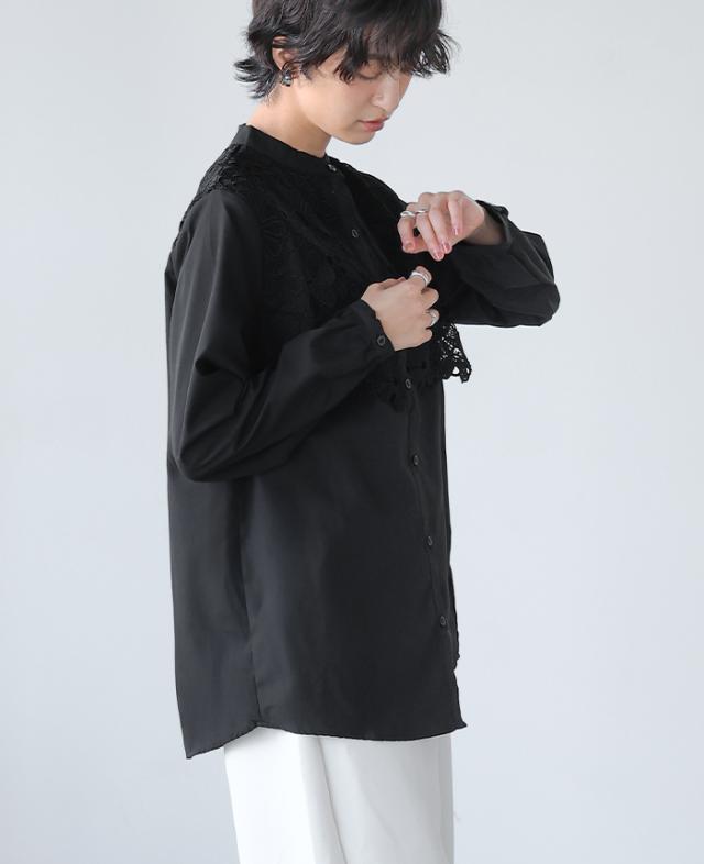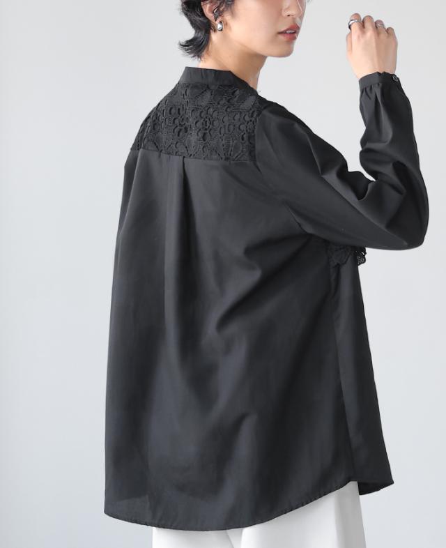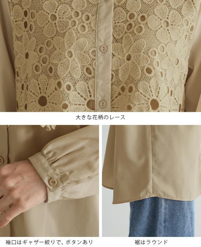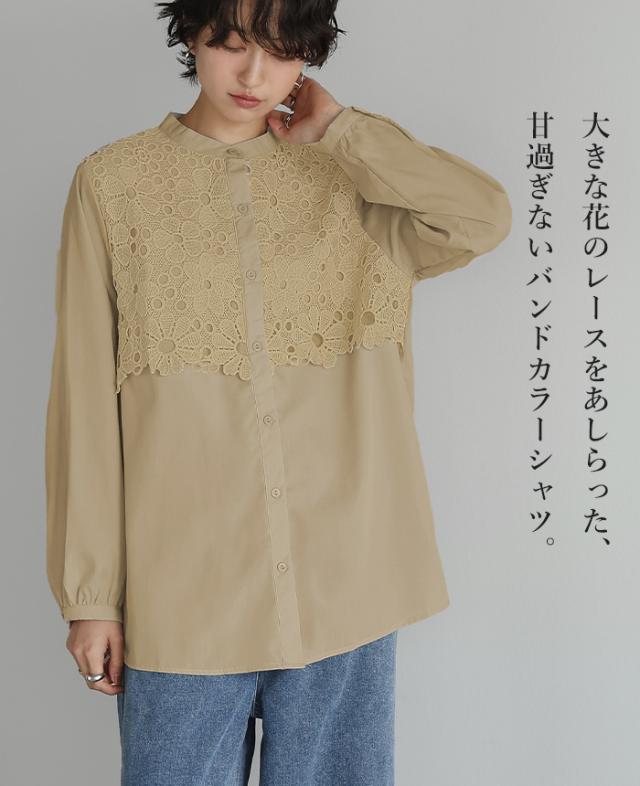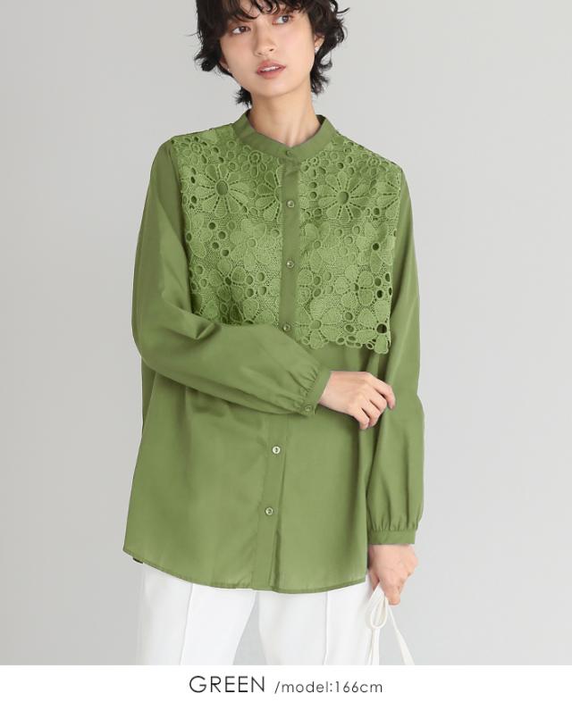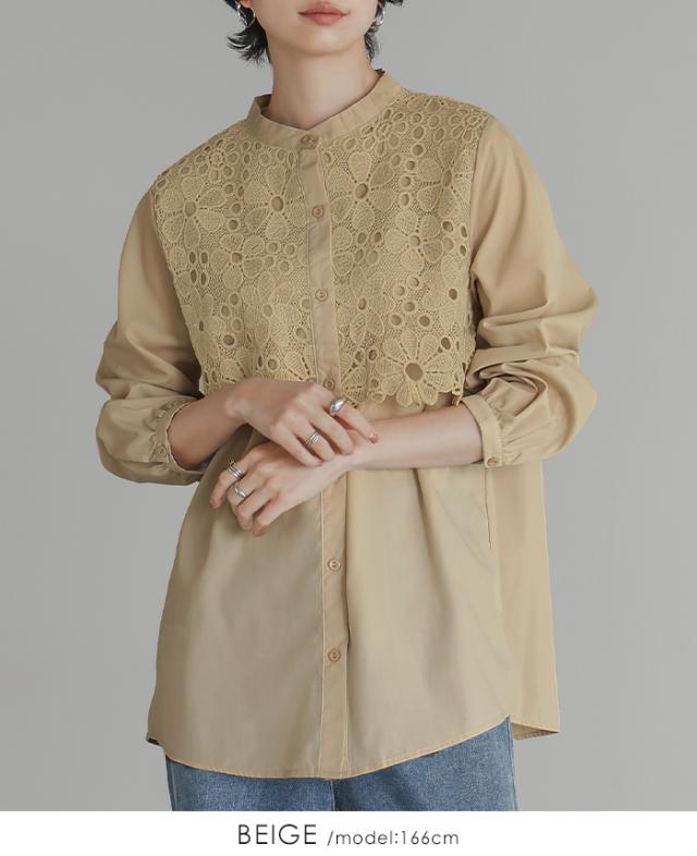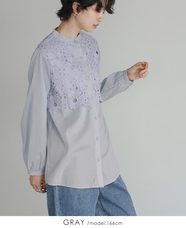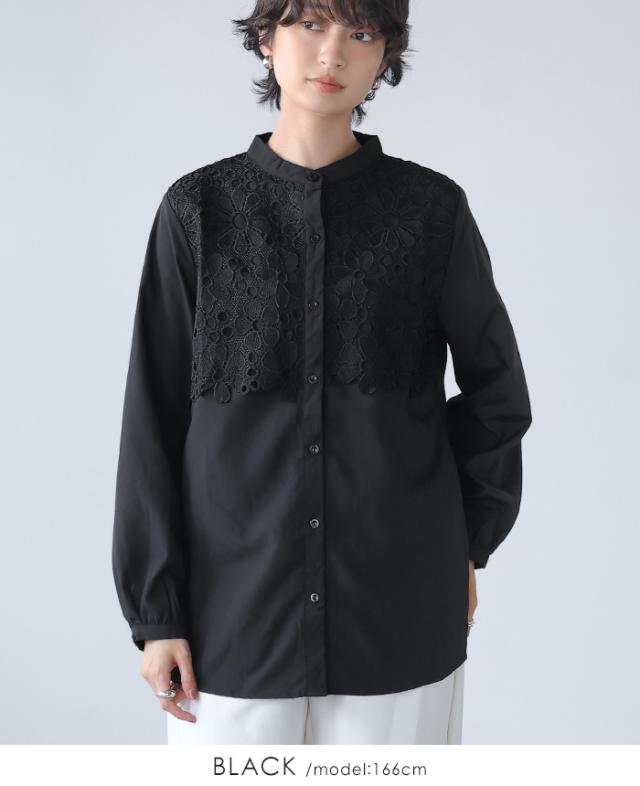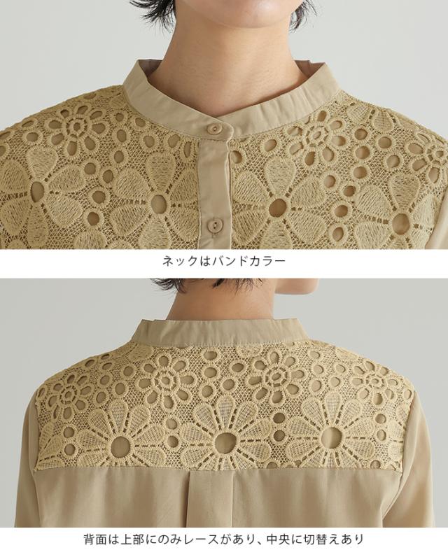 レイヤード レース ブラウス シャツ ボリューム袖 レディース トップス バンドカラー 長袖 ゆったり 大きいサイズ 体型カバー 秋冬【メール便1点まで】[M便 1/1]