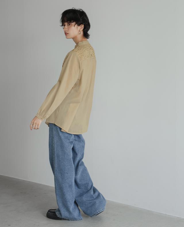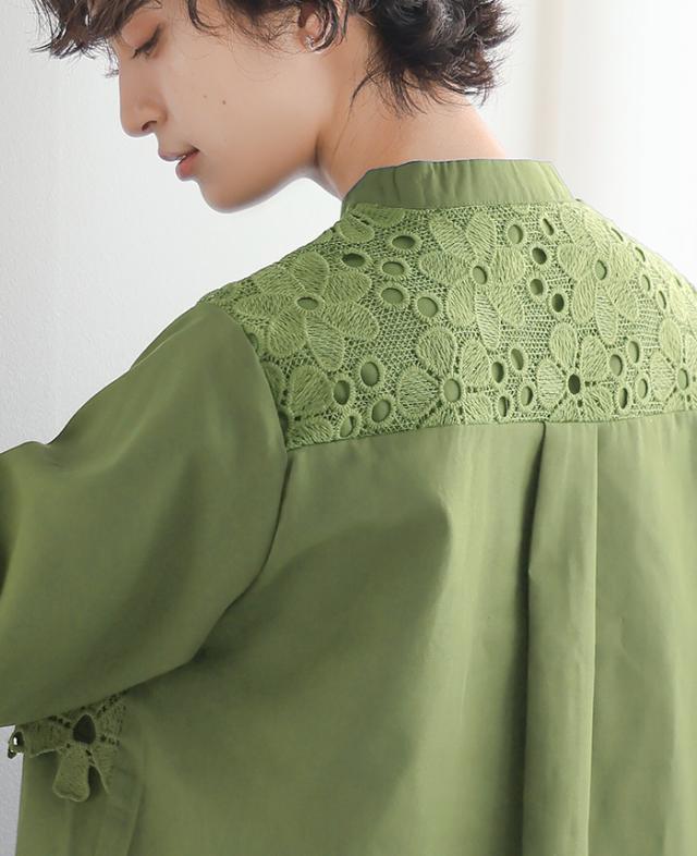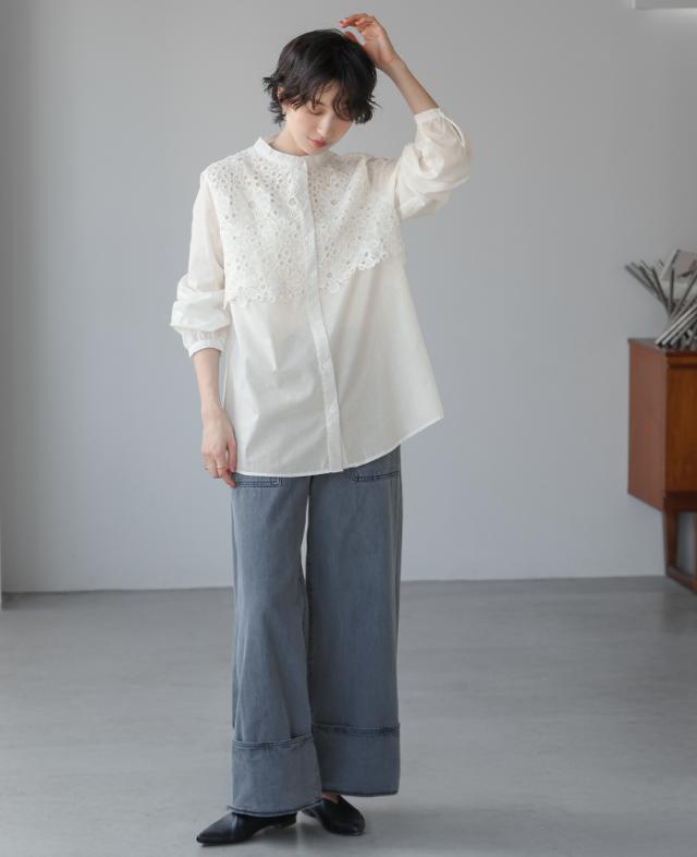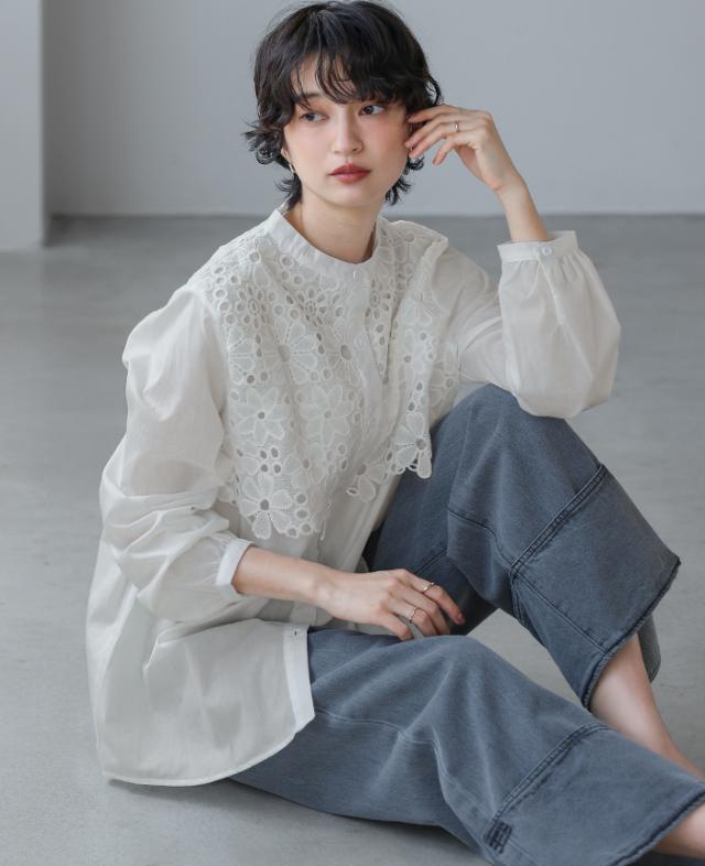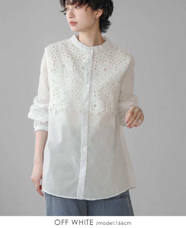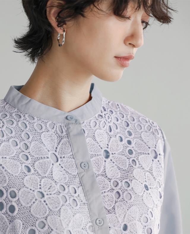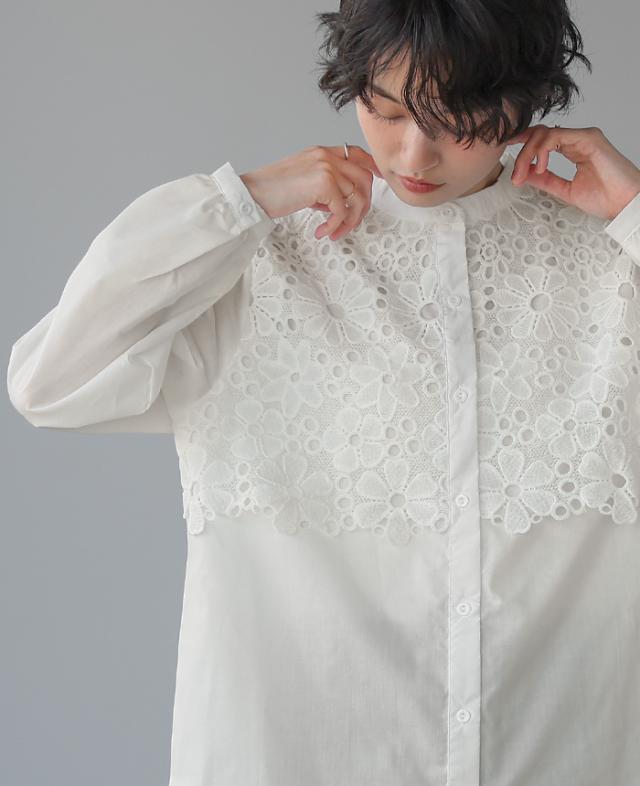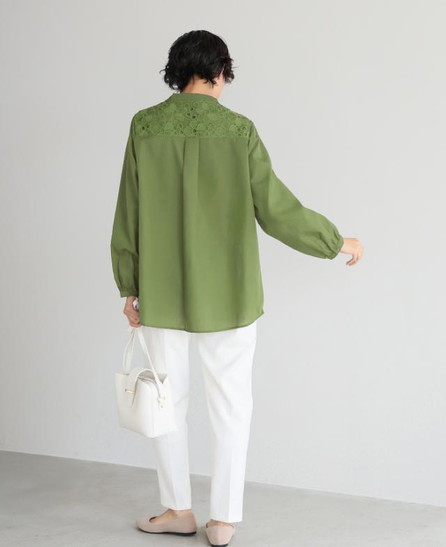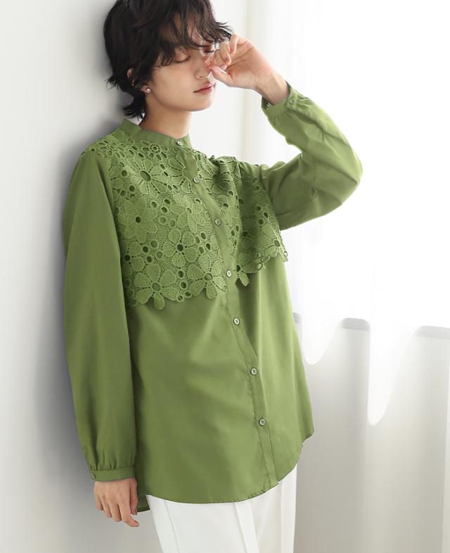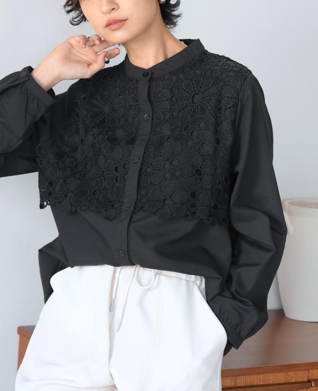 レイヤード レース ブラウス シャツ ボリューム袖 レディース トップス バンドカラー 長袖 ゆったり 大きいサイズ 体型カバー 秋冬【メール便1点まで】[M便 1/1]