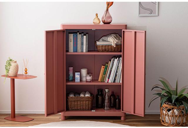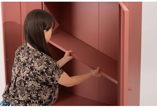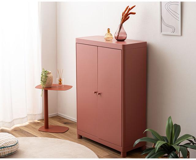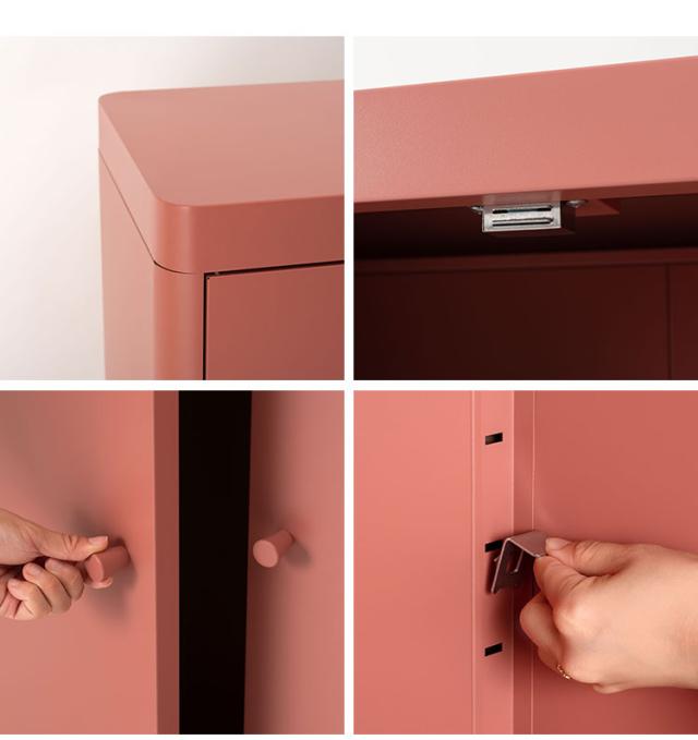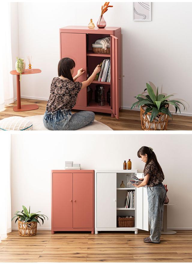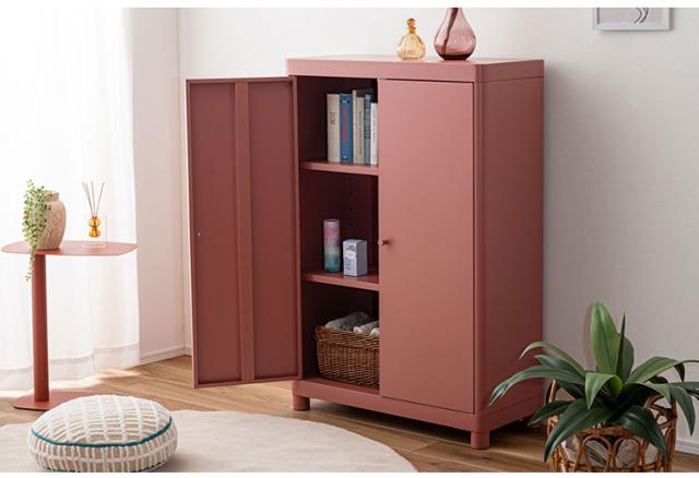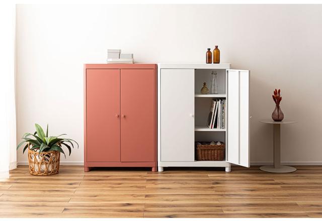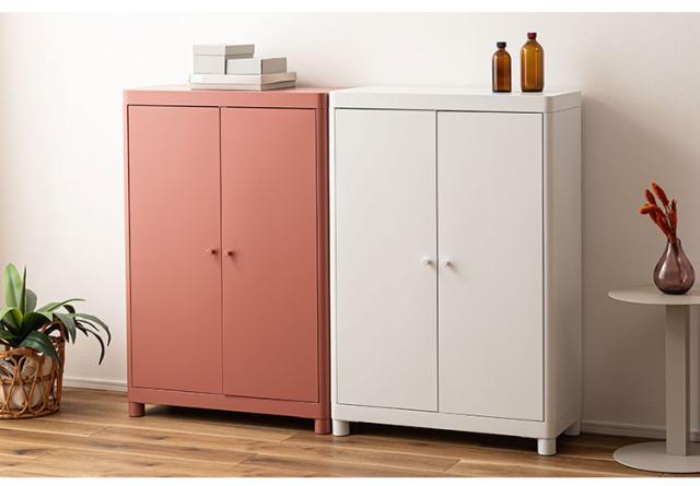 マットな質感と洗練されたシンプルデザイン スチールを使用したシンプルでモダンなチェスト。マットな質感となめらかな曲線が美しく、空間に上品な印象を与えます。収納するものによって高さを変えることができる可動棚のため、スペースを活かして使用できます。マグネットキャッチを採用しているため、しっかりとドアを固定します。スチール素材のため磁石やマグネットクリップとの相性が良く、写真やメモを貼って使うこともできます。