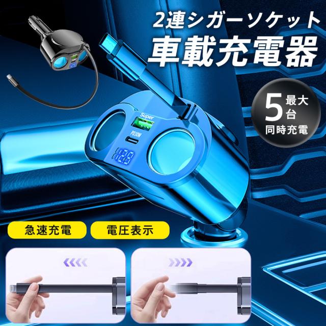 シガーソケット カーチャージャー USB 増設 2連 車載充電器 12V/24V スマホ 急速充電 電圧計付き typ