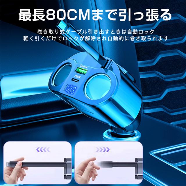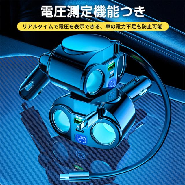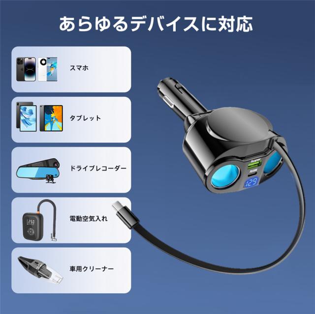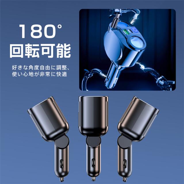 シガーチャージャー シガーソケット 車 充電器 120W カーチャージャー 5ポート 5in1 PD対応 5台同時充電 usbボート 延長コード 3連 4連 usb コンセント 巻き取り式 iPhone/Android タブレット充電 99%車種対応 角度 自由調節 車用品 カー用品 車中泊グッズ トラック 防災グッズ USB電源増設 電流表示 快速 高速