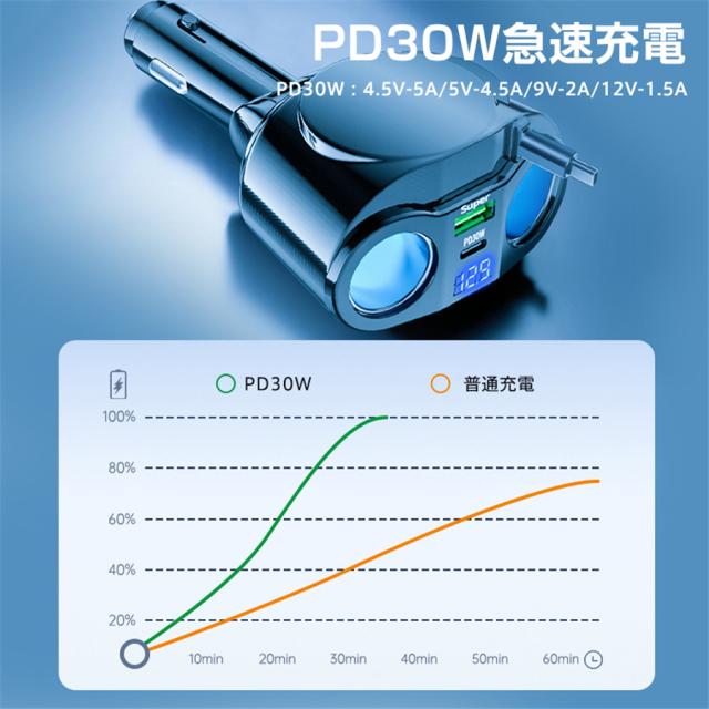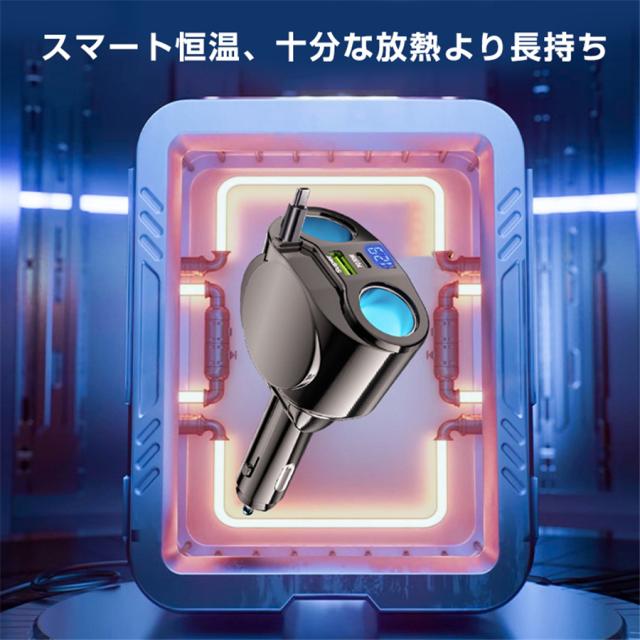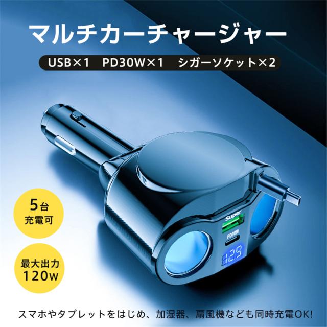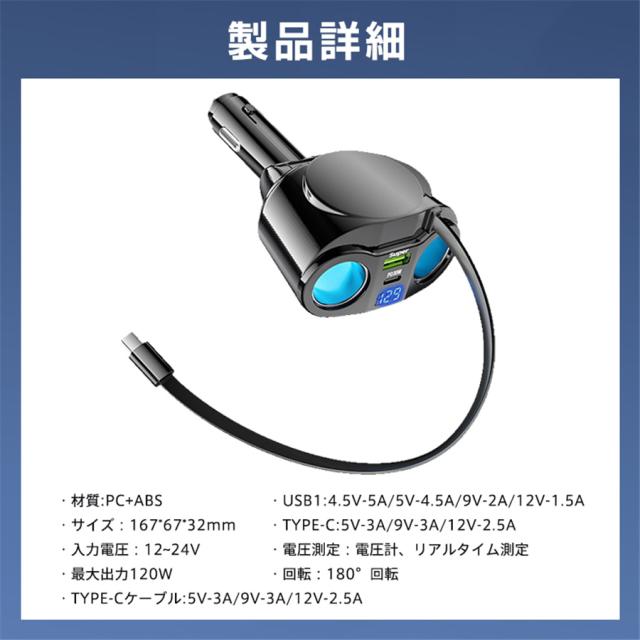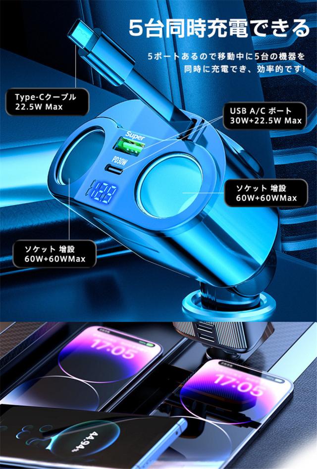 シガーチャージャー シガーソケット 車 充電器 120W カーチャージャー 5ポート 5in1 PD対応 5台同時充電 usbボート 延長コード 3連 4連 usb コンセント 巻き取り式 iPhone/Android タブレット充電 99%車種対応 角度 自由調節 車用品 カー用品 車中泊グッズ トラック 防災グッズ USB電源増設 電流表示 快速 高速