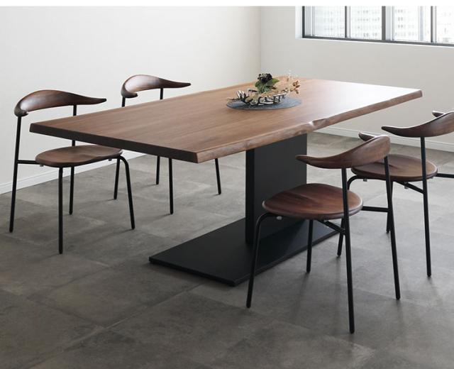 180cm幅のウォールナット素材でできた一枚板風のテーブルです。天厚4cmの重厚感と、天然杢ノタ面の本来の木の風合い、そして天板は1cm厚の単板を使用することにより木目がしっかりと出て高級感が感じられます。