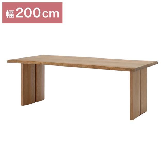 オーク素材と木脚の組み合わせの200cm幅一枚板風のテーブルです。天厚4cmの重厚感と、天然杢ノタ面の本来の木の風合い、そして天板は1cm厚の単板を使用することにより木目がしっかりと出て高級感が感じられます。