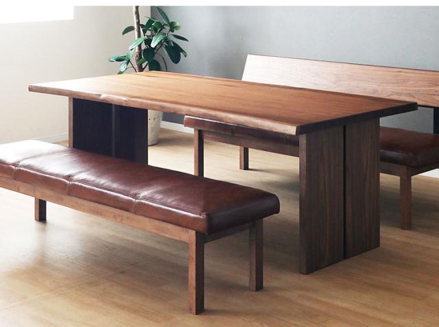 ウォールナット素材と木脚の組み合わせの180cm幅一枚板風のテーブルです。天厚4cmの重厚感と、天然杢ノタ面の本来の木の風合い、そして天板は1cm厚の単板を使用することにより木目がしっかりと出て高級感が感じられます。