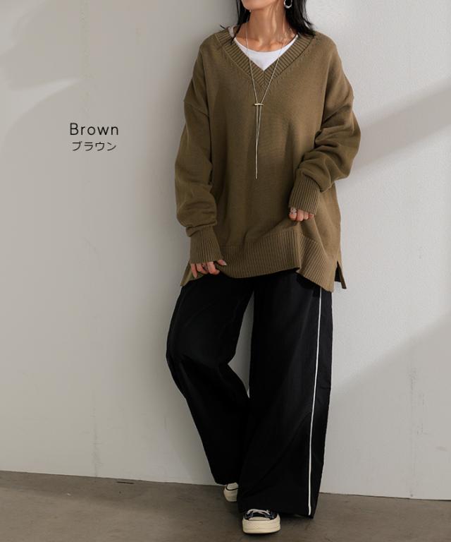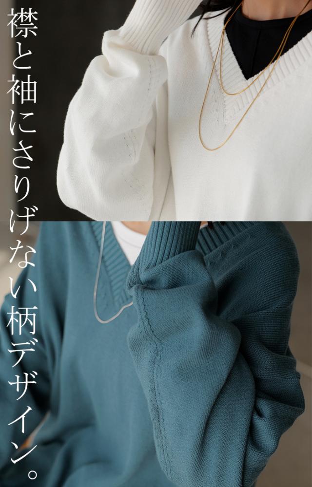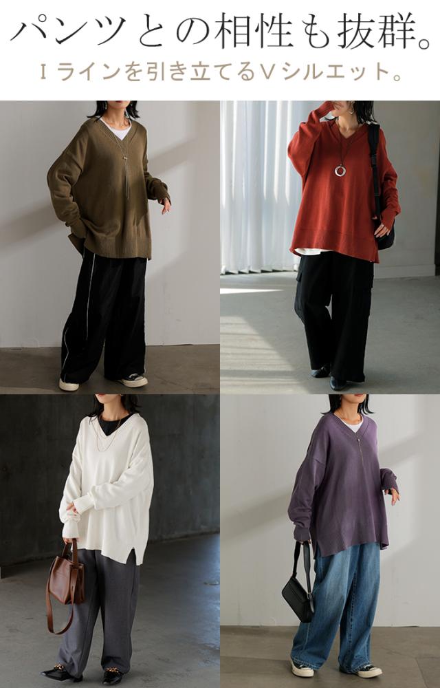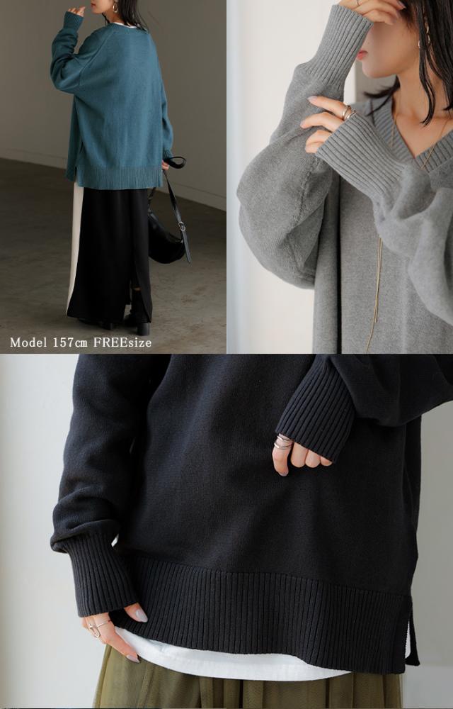 2025AW新作 ニット ロング レディース トップス セーター ハイゲージ オーバー プルオーバー 長袖 ボリュームスリーブ Vネック リブ チュニック ドルマン ゆったり 体型カバー 大きいサイズ お尻が隠れる カジュアル きれいめ 黒 白 秋 冬 HUG.U