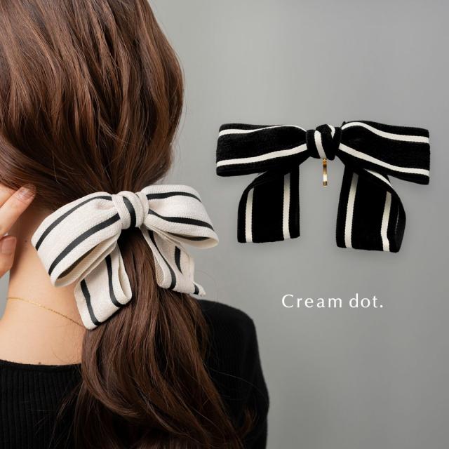 【ゆうパケット送料無料】 ポニーフック リボン 大きめ バイカラー ビッグリボン モノトーン ストライプ ヘアフック ヘアカフス ヘアアクセ ヘアアレンジ 簡単 まとめ髪 髪留め 大人 黒 ブラック アイボリー