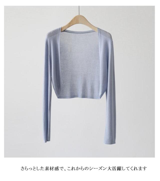 | オープンフロントでサラッと羽織れるボレロカーディガン 紫外線を通しにくい素材でUVカット 薄手で持ち運びしやすく、真夏日の日除けや冷房対策に! さらっとした素材感で、これからのシーズン大活躍してくれます コンパクトな丈感が身長問わず着やすいポイント ノースリーブのトップスやワンピースに合わせて、ヘルシーな肌見せも叶う1着です | |