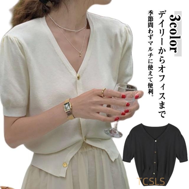 トップス 3分袖 レディース パフスリーブ クラシック カーデガン パフ袖 トップス Vネック 上品 夏 白 薄手 半袖 きれいめ カーディガン カジュアル 半袖 ブラック 黒 ホワイト 前開き