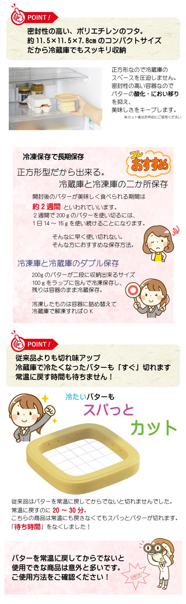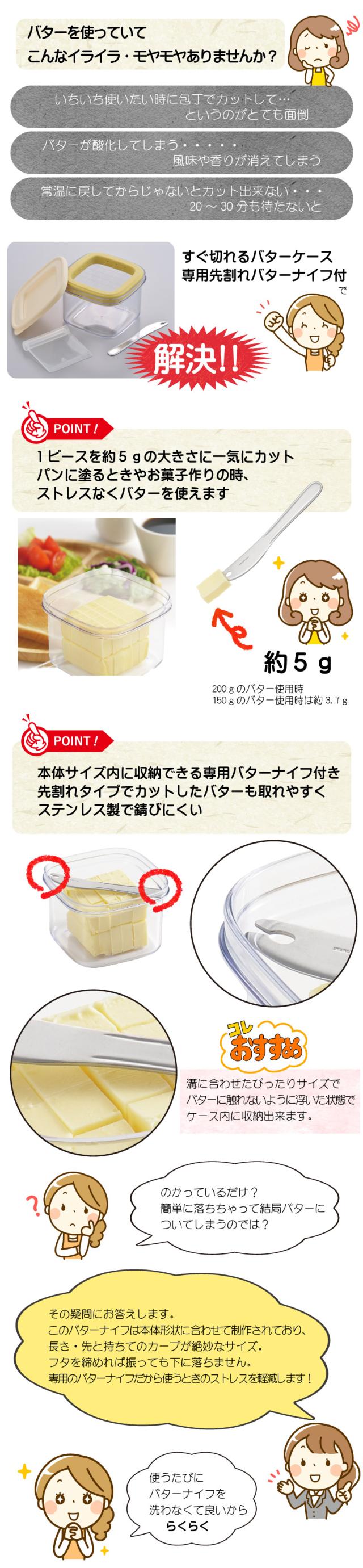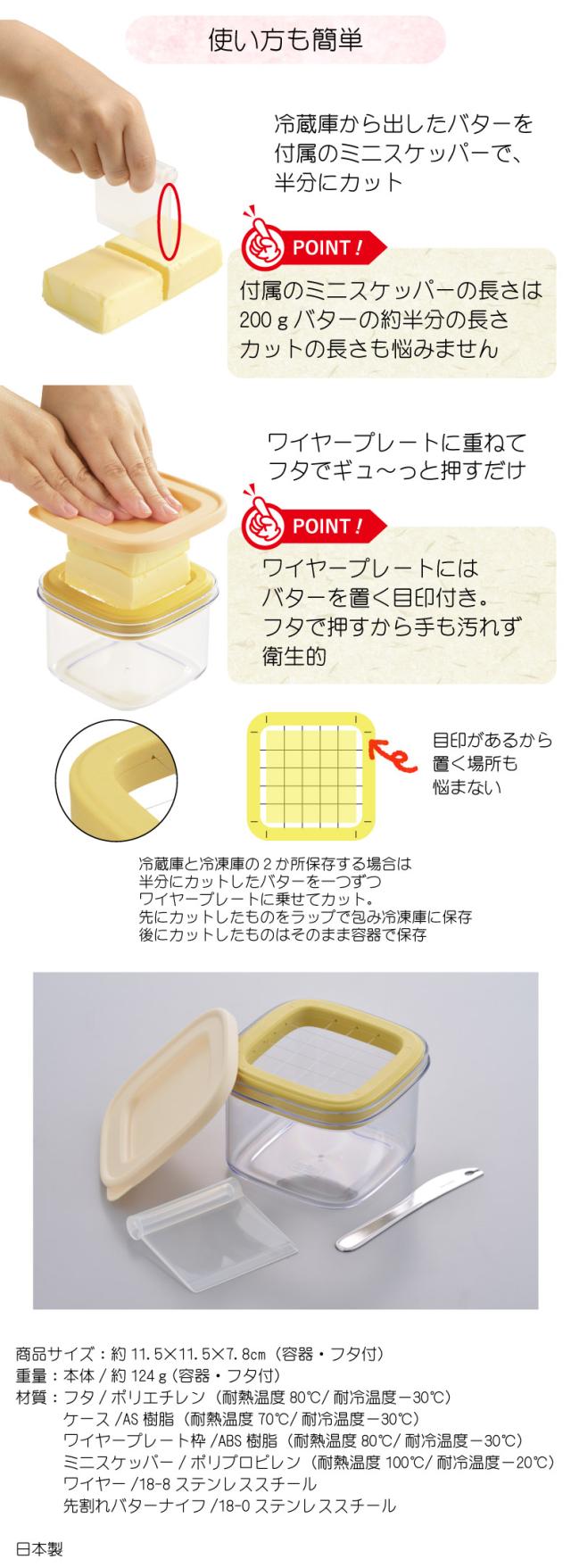 冷たくて固いバターでも「すぐ」切れる! 切れ味アップで切る前の「待ち時間」をなくしました。 カットしたバターが取り出しやすく、ケースにスッキリ収納出来る専用先割れバターナイフ付き 収納しやすいコンパクトな保存ケース。バターが酸化しにくい、密閉タイプのフタ 1ピース約5gにカットできます(200gのバター使用時) 1ピース約3.7gにカットできます(150gのバター使用時) 商品サイズ:約11.5×11.5×7.8cm(容器・フタ付) 重量:本体/約124g(容器・フタ付) 材質:フタ/ポリエチレン(耐熱温度80℃/耐冷温度−30℃)、ケース/AS樹脂(耐熱温度70℃/耐冷温度−30℃)、ワイヤープレート枠/ABS樹脂(耐熱温度80℃/耐冷温度−30℃)、ミニスケッパー/ポリプロピレン(耐熱温度100℃/耐冷温度−20℃)、ワイヤー/18-8ステンレススチール、先割れバターナイフ/18-0ステンレススチール 日本製 化粧箱入