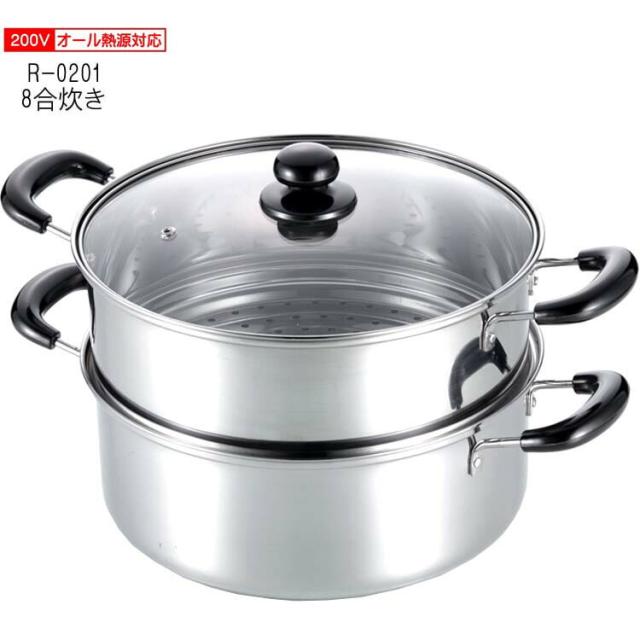 たっぷりサイズの2段蒸し器。約8合炊きまでOK! 高さ9cmの器が入ります(蒸し器)。蒸し器をはずせば大型鍋に!下鍋だけで茹でたり煮込んだり。料理の様子がわかるガラス蓋。 蒸し上手ステンレス2段蒸し器26cm R-0201 IH対応[ガス火もOK] オール熱源対応、サイズ:約39.5×27.5×23cm、重量:約1,940g、下鍋満水容量:5.5L、 材質:本体/ステンレス鋼(クロム18%)、底厚:0.5mm、蓋/強化ガラス、ハンドル・ツマミ/フェノル樹脂、