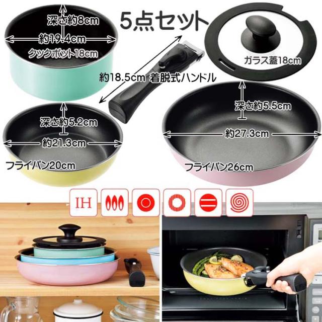 ハンドルが外せるので調理した料理をそのまま食卓へ並べることができます。重ねてコンパクトに収納できるので収納時も省スペース。内面フッ素樹脂加工なのでお手入れも簡単です。便利な5点セット。フライパン20cm、26cm、クックポット18cm、ガラス蓋18cm、着脱式ハンドルの5点。 オール熱源対応。