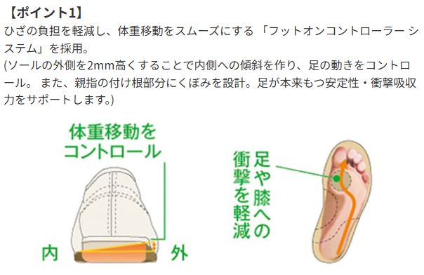 ソールの内側を2mm高くして、内側へ緩やかな傾斜を作ることで、足の動きをコントロール。 親指の付け根部分に1mmのくぼみを付けることで、足が本来持っている「姿勢を安定させる力」「衝撃を吸収する力」をサポート。