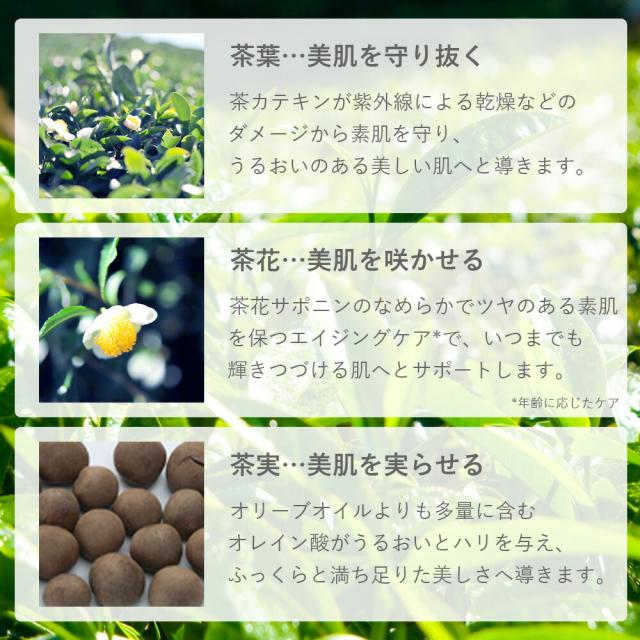 紫外線からお肌を守り、乾燥を防ぐ 主原料である大和茶の茶葉・茶花*1・茶実*2に、国産アロエベラ*3やタマヌ*4などを中心とした美容保湿成分を配合。お肌にふっくらとしたハリ感を与え、日焼けによるシミ・ソバカスを防ぎ、健やかなお肌へと導きます。天然由来成分100%。紫外線吸収剤不使用で、海や地球環境に優しいリーフセーフ処方。