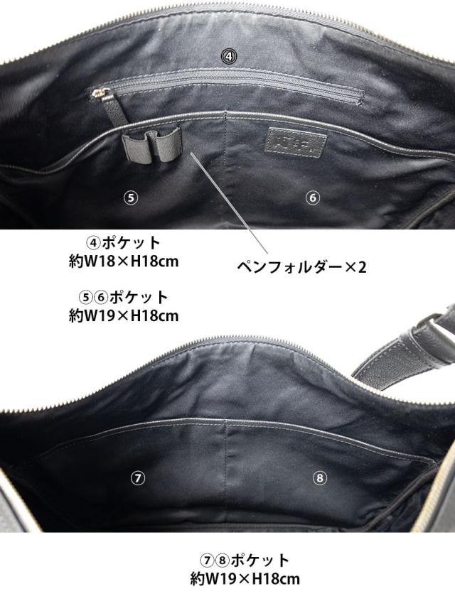 A4ファイル対応サイズ。内ポケットが5つ、ペンフォルダーもありビジネスユースにお勧めです。ファスナーが端から端まで開くので出し入れしやすく機能的です。スマホは背面ポケットが便利です。