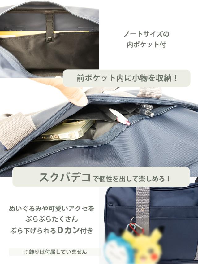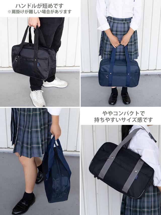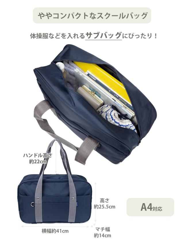 A4ファイル対応サイズですがややコンパクトなサイズ感です。リュック等に入りきらない教科書や体操服、部活グッズを入れるサブバッグとしてもお勧めです。通学以外に大人も普段持ちに便利にお使いいただけます。