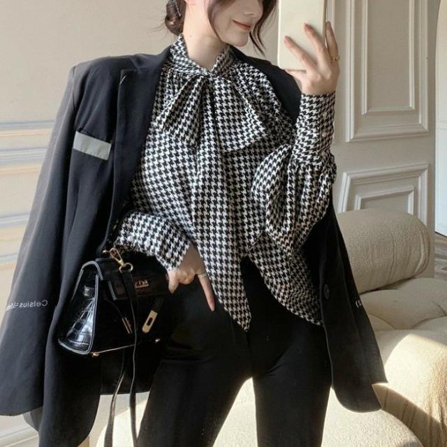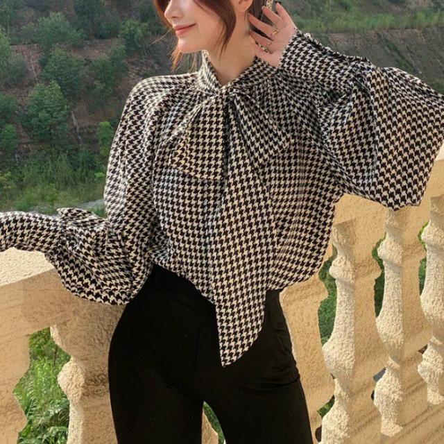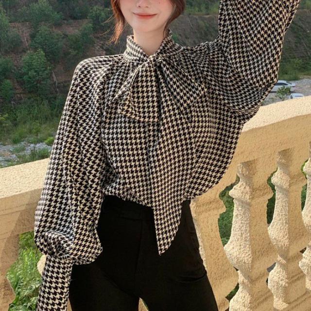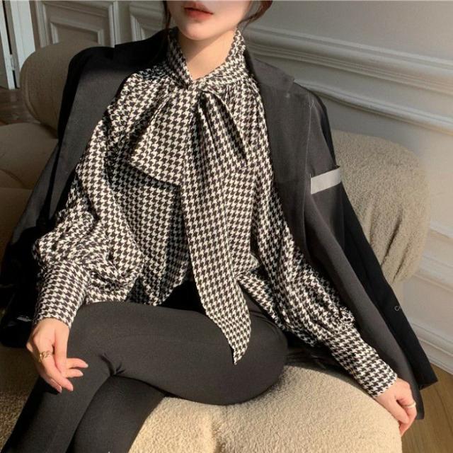 2022年 秋冬 千鳥柄 リボン シフォン ボリュームスリーブ トップス ニット セーター シャツレディースファッション