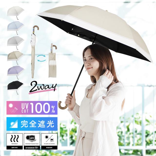 UVカット率100%と遮光率100%を誇り、太陽光からしっかり守ります。耐久性に優れたグラスファイバー製の親骨を使用しており、風に強い構造で安心。2way式で、シーンに合わせて長傘・折りたたみ傘にできるのも魅力の一つ。手に馴染む合皮レザーハンドルは、持ち運びにも便利でスタイリッシュです。