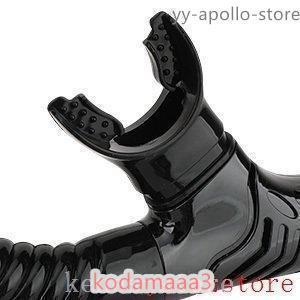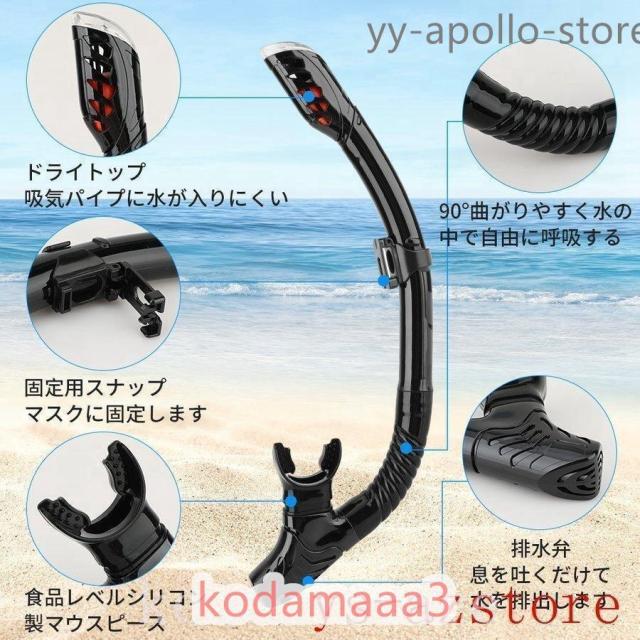 曲がりパイプで水の抵抗を抑えることで口元の負担も軽減できる。安心してシュノーケリングを楽しめるセットになっています。