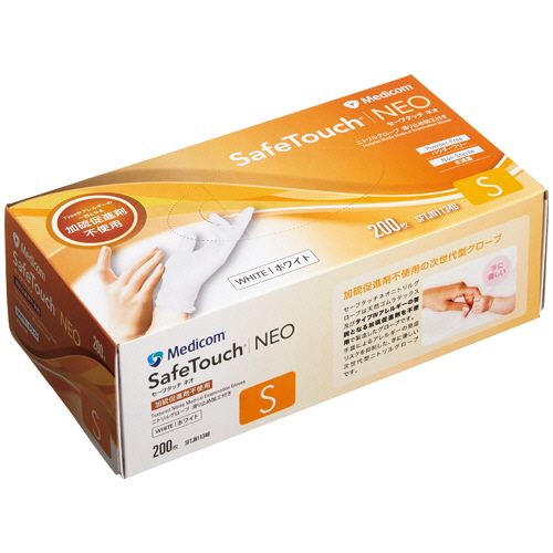 ●パウダーフリー・ホワイトのニトリルグローブ。Sサイズ、200枚入です。●「加硫促進剤」によるアレルギーとは。加硫促進剤によるアレルギー反応は、タイプIV遅延型アレルギーに分類され、痒みを伴う紅斑、浮腫、漿液性丘疹、乾燥、亀裂が出現します。また、慢性化すると治りにくく、さらに化学物質への曝露量が増えてしまいます。メディコム「セーフタッチネオニトリルグローブ」は、手袋を使用する方々のこうした状況を改善するために開発された、「加硫促進剤不使用」のニトリルグローブです。