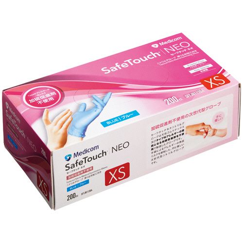 ●パウダーフリー・ブルーのニトリルグローブ。XSサイズ、200枚入です。●「加硫促進剤」によるアレルギーとは。加硫促進剤によるアレルギー反応は、タイプIV遅延型アレルギーに分類され、痒みを伴う紅斑、浮腫、漿液性丘疹、乾燥、亀裂が出現します。また、慢性化すると治りにくく、さらに化学物質への曝露量が増えてしまいます。メディコム「セーフタッチネオニトリルグローブ」は、手袋を使用する方々のこうした状況を改善するために開発された、「加硫促進剤不使用」のニトリルグローブです。