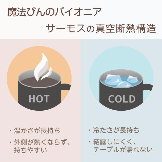 保温・保冷◎サーモスの真空断熱魔法びん構造が、飲み物の温度をキープ。ホットドリンクも冷たいドリンクも、美味しく楽しめます。