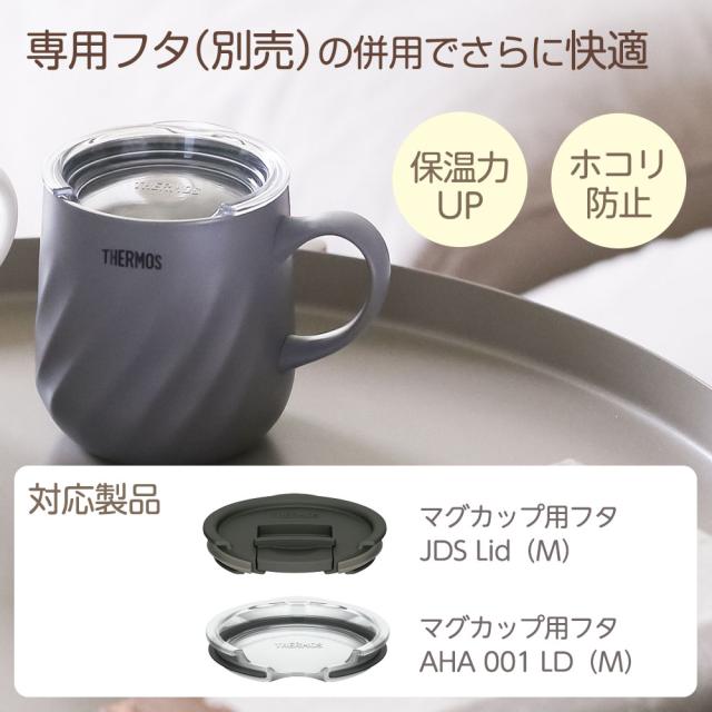 別売りフタでさらに快適マグカップ用のフタ(別売)を取り付けることでさらに保温力アップ。埃なども防ぐことができます。