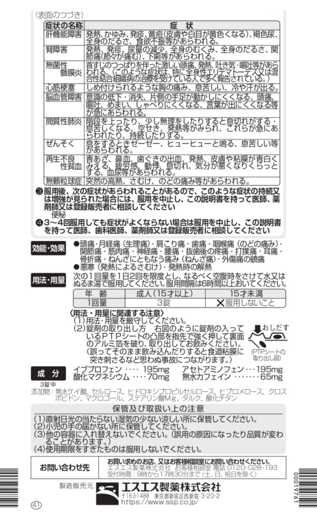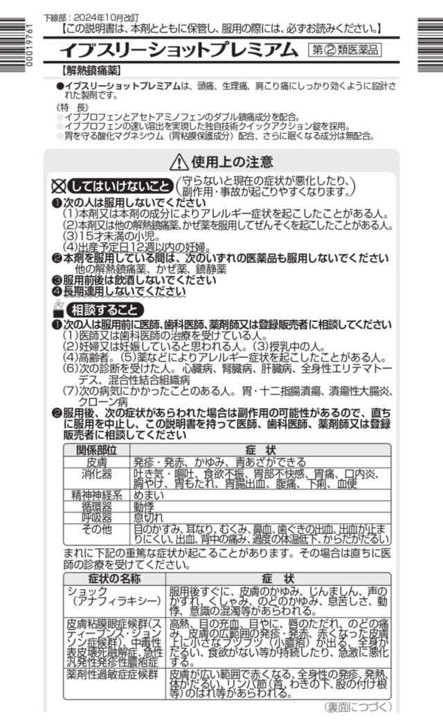 商品名 指定第2類医薬品 イブスリーショットプレミアム 90錠 ※セルフメディケーション税制対象商品 容量 90錠 JANコード 4987300059821 メーカー エスエス製薬 カテゴリー 医療・介護・医薬品>医薬品>頭痛・痛み止め>頭痛・痛み止め【第一・二類医薬品(指定第二医薬品含む)】 効果・効能 ●頭痛・月経痛(生理痛)・肩こり痛・歯痛・咽喉痛(のどの痛み)・関節痛・筋肉痛・神経痛・腰痛・抜歯後の疼痛・打撲痛・耳痛・骨折痛・ねんざにともなう痛み(ねんざ痛)・外傷痛の鎮痛