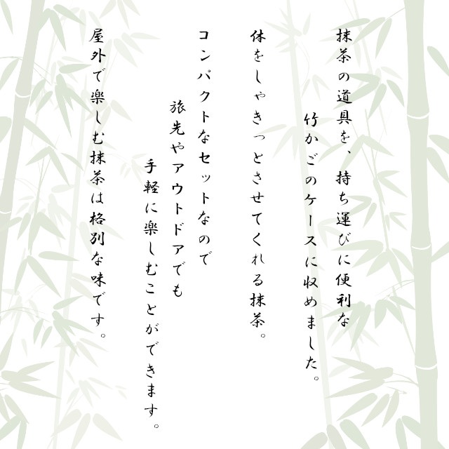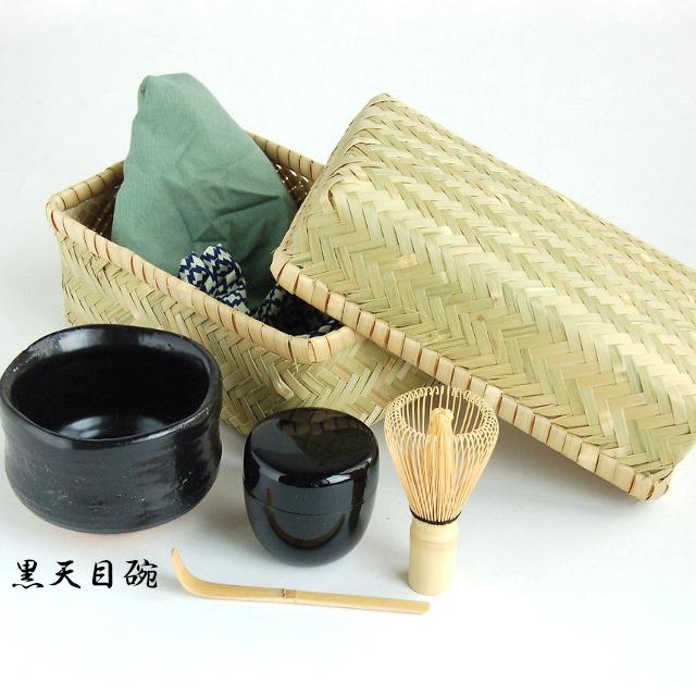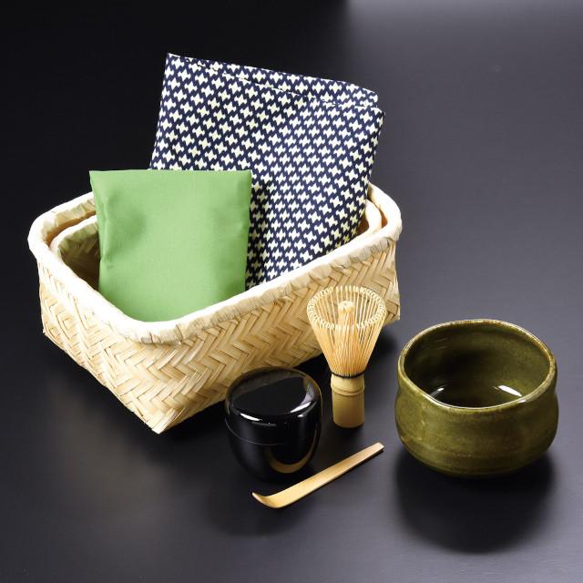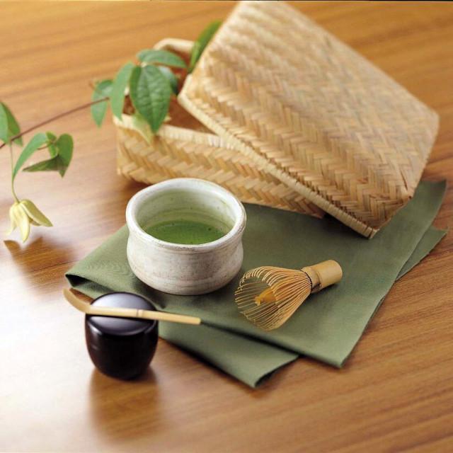 抹茶の道具を、持ち運びに便利な竹かごのケースに収めました。 |