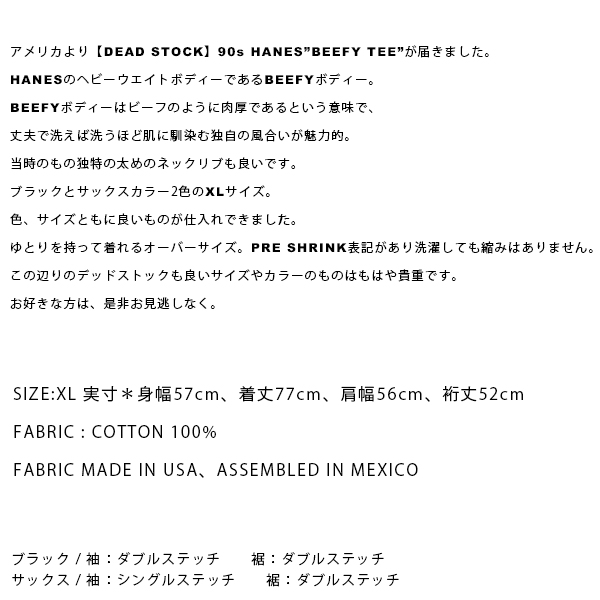 DEAD STOCK / HANES BEEFY TEE / FABRIC MADE IN USA / ASSEMBLED IN MEXICO / SIZE XL / BLACK / SAX / hanes-import-001 / ネコポス配送