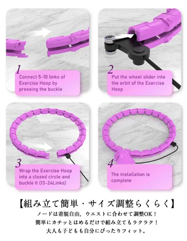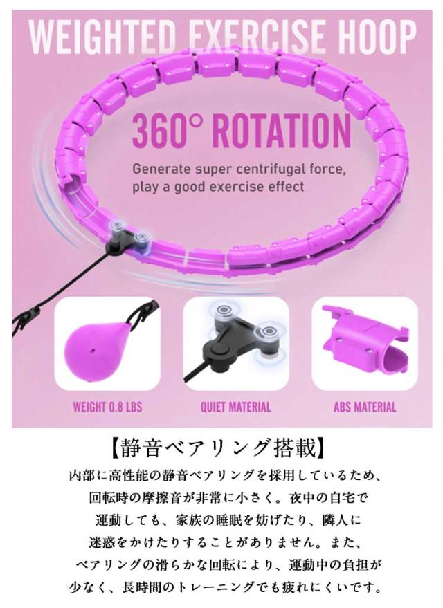 | 楽しく回して、運動不足&ダイエット解消!家族みんなで使えるフラフープ。 【組み立て簡単・サイズ調整らくらく】ノードは着脱自由,ウエストに合わせて調整OK!簡単にカチッとはめるだけで組み立てもラクラク!大人も子どもも自分にぴったりフィット。 【静音ベアリング搭載】内部に高性能の静音ベアリングを採用しているため、回転時の摩擦音が非常に小さく。夜中の自宅で運動しても、家族の睡眠を妨げたり、隣人に迷惑をかけたりすることがありません。また、ベアリングの滑らかな回転により、運動中の負担が少なく、長時間のトレーニングでも疲れにくいです。 【落ちないから簡単&快適】 スマートフラフープはウエストにしっかりフィットし、スムーズに回り続けます。初心者や運動が苦手な方でも、簡単に楽しみながら効果的にエクササイズができます。 【脂肪燃焼&ウエスト引き締めに効果的】毎日10分回すだけで腹筋・腰回りを効率的に刺激!有酸素運動による脂肪燃焼と、フープの圧によるマッサージ効果で、効果的にぽっこりお腹を改善。 【軽量・コンパクトで収納・持ち運びラクラク】:分解してコンパクトに収納可能。出張や旅行先でも持ち運びラクラク。 | |