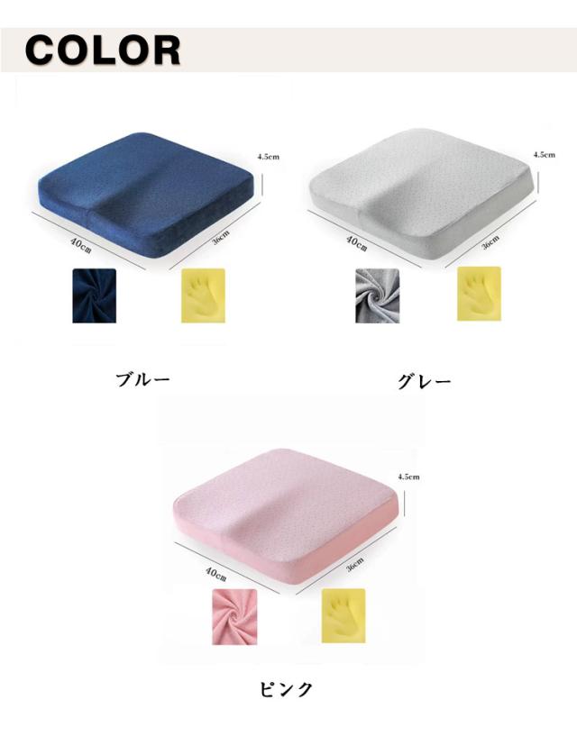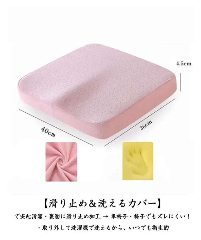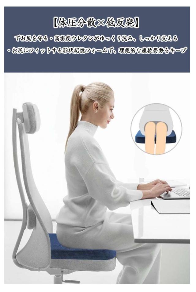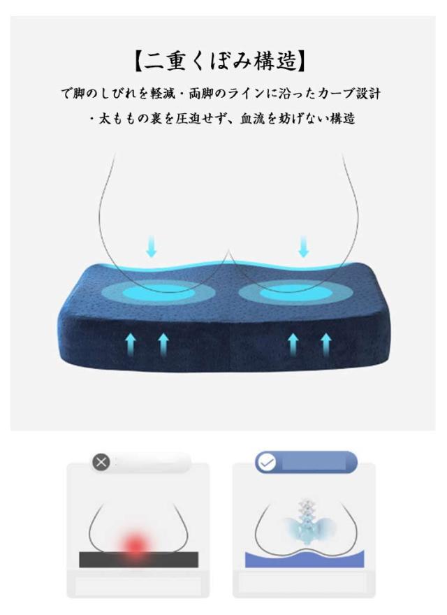 | 長時間の座位でも、疲れない・痛くない! このクッションは、お尻や尾てい骨に集中する体圧を広く分散し、長時間座っていても痛くならない。 【体圧分散×低反発】でお尻を守る ・高密度ウレタンがゆっくり沈み、しっかり支える ・お尻にフィットする形状記憶フォームで、理想的な座位姿勢をキープ 二重くぼみ構造】で脚のしびれを軽減 ・両脚のラインに沿ったカーブ設計 ・太ももの裏を圧迫せず、血流を妨げない構造 【滑り止め&洗えるカバー】で安心清潔 ・裏面に滑り止め加工 → 車椅子・椅子でもズレにくい! ・取り外して洗濯機で洗えるから、いつでも衛生的 | |