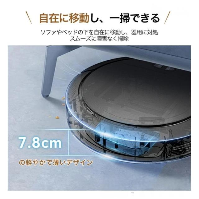 約7cmの超薄型掃除ロボットで、ソファーやベッド、家具の下など、ホコリが溜まりやすく掃除がしにくい場所でも簡単に入り込み、しっかりゴミを吸引してくれます。さらに、大容量700mlのダストボックスを搭載しており、たくさんのゴミやホコリを集めることができます。ダストボックスは水洗いが可能なので、衛生的に保てます。掃除の手間を減らし、清潔に保つのに最適です。