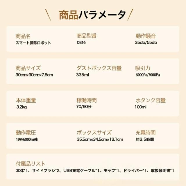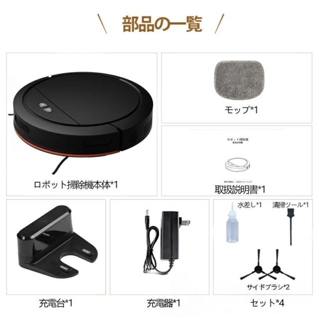 ロボット掃除機本体×1、充電台×1、AC アダプター×1、取扱説明書*1、モップ×1、プラシ×1