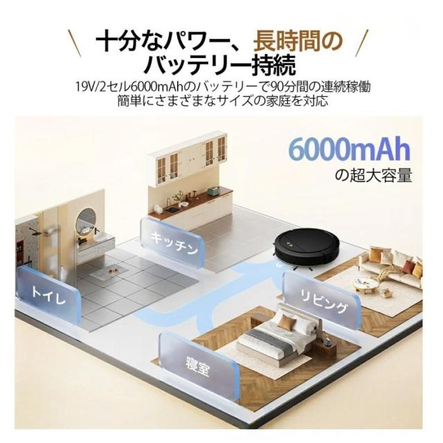 パワフルな吸引力と長時間の稼働時間によって、掃除効率を高めます。最大8500Paの吸引力で、細かなホコリやゴミ、ペットの毛などをしっかりと吸い取ります。さらに、最長130分間の連続稼働時間は、一度の充電で多くの部屋を掃除することができます。
