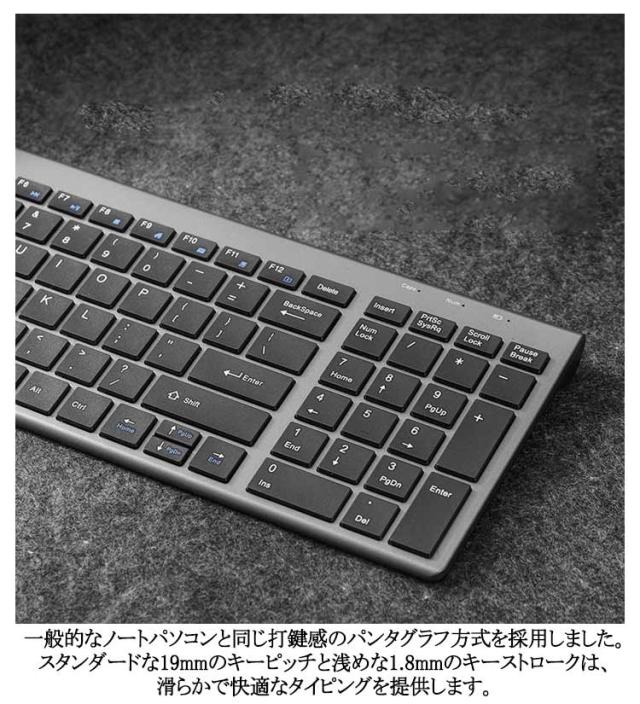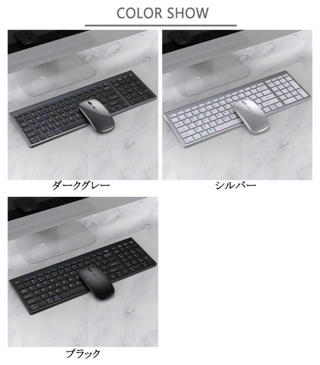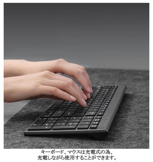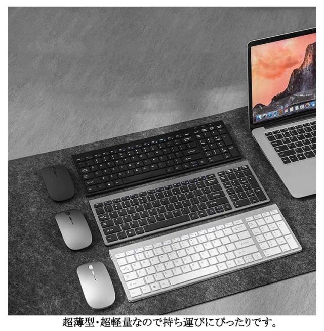 | 薄型のワイヤレスキーボードと持ち運びに便利なワイヤレスマウスのセットです。 洗練されたボディとシンプルでスタイリッシュなデザインがデスクを上質な空間に仕上げます。 超薄型・超軽量なので持ち運びにぴったりです。 キーボード、マウスは充電式の為、充電しながら使用することができます。 一般的なノートパソコンと同じ打鍵感のパンタグラフ方式を採用しました。スタンダードな19mmのキーピッチと浅めな1.8mmのキーストロークは、滑らかで快適なタイピングを提供します。 マウスはクリック音を抑えたサイレントスイッチを採用しており、静かなクリック音を実現。図書館などでも周囲を気にせずに使用できます。 また、用途に応じてカーソルのスピードを800/1200/1600の三段階手軽に切替可能です。一つの「DPI」ボタンを押すだけで実現できます。 Windows、Android、macOS、iOSなど様々な機器で使用できます。基本的にBluetooth搭載しているiPad、スマホ、PC等、各種の端末に対応します。 最大10Mまで通信できるので、距離や位置に気にせず自由自在に移動できます。 キーボードはパソコンやスマートフォンなど、Bluetoothを内蔵した機器とレシーバーなしで接続できます。マルチペアリング対応で3台の機器を切り替えて使える。 マウスは2.4GHzワイヤレステクノロジーを採用し、ドライバーのダウンロードや設定が不要で、PCにUSBレシバーを接続すればすぐに使えます。 | |
